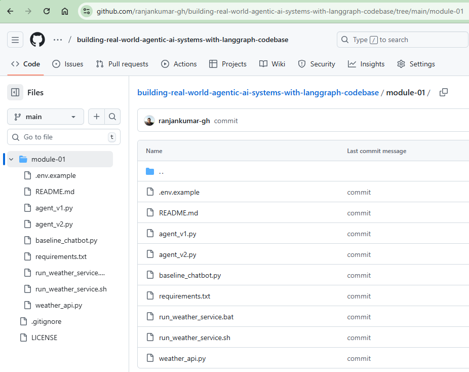 All code for this module is available in: https://github.com/ranjankumar-gh/building-real-world-agentic-ai-systems-with-langgraph-codebase/tree/main/module-01